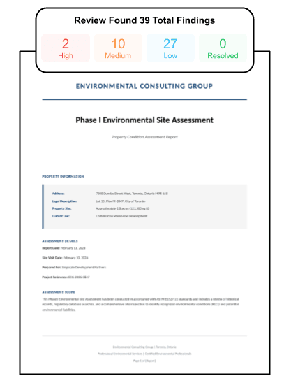 Environmental, appraisal, geotech, traffic, and technical risks are buried in dense consultant reports — and interpreted differently by each party.