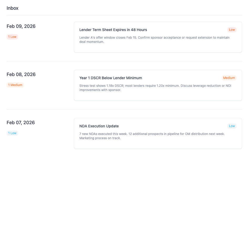 Scan deal-related emails to flag scope changes, revised assumptions, and material updates that impact underwriting.