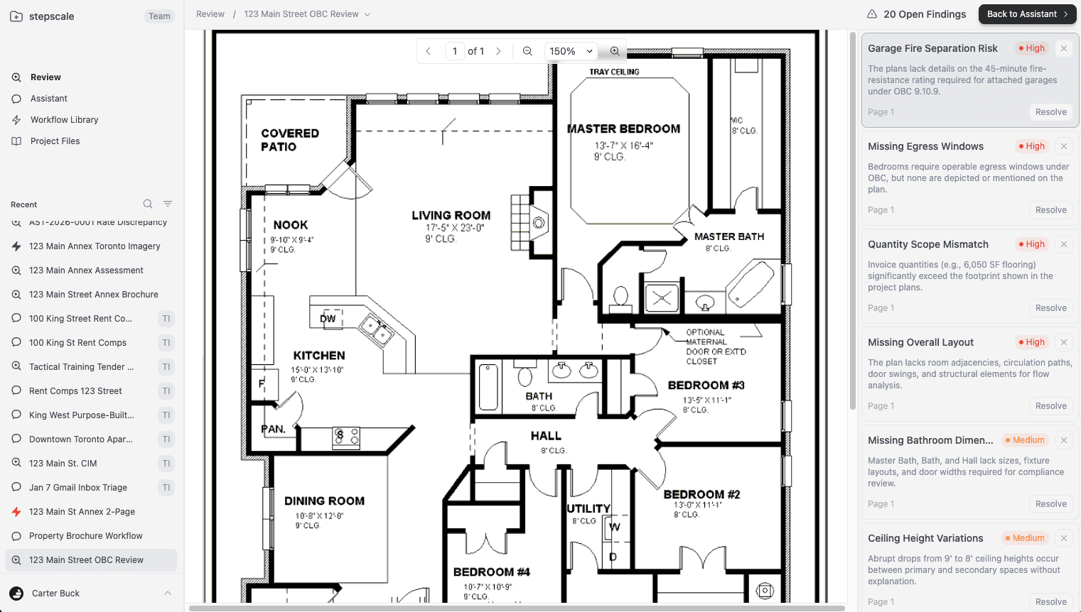 As you review, you’ll see the document side-by-side with AI findings organized by page and severity, giving you clear visibility into issues as you work. You can ask the Stepscale Assistant for clarification or deeper analysis on any finding at any time.