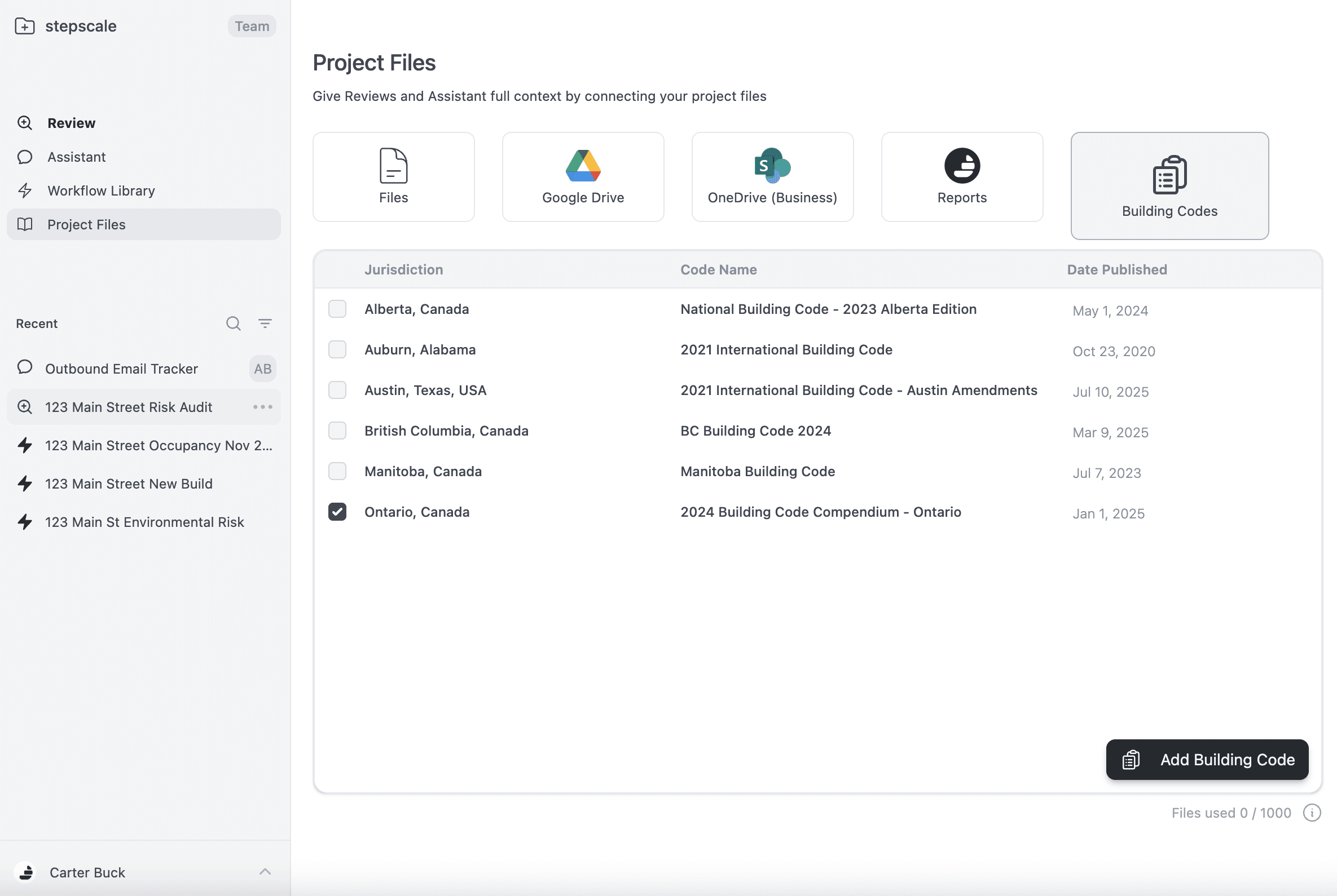 Stepscale automatically selects the relevant code based on your project location. You can also select from a list of current Building Codes directly in Project Files. If a code isn’t available in the list, just upload it as the default code to use in that Project.